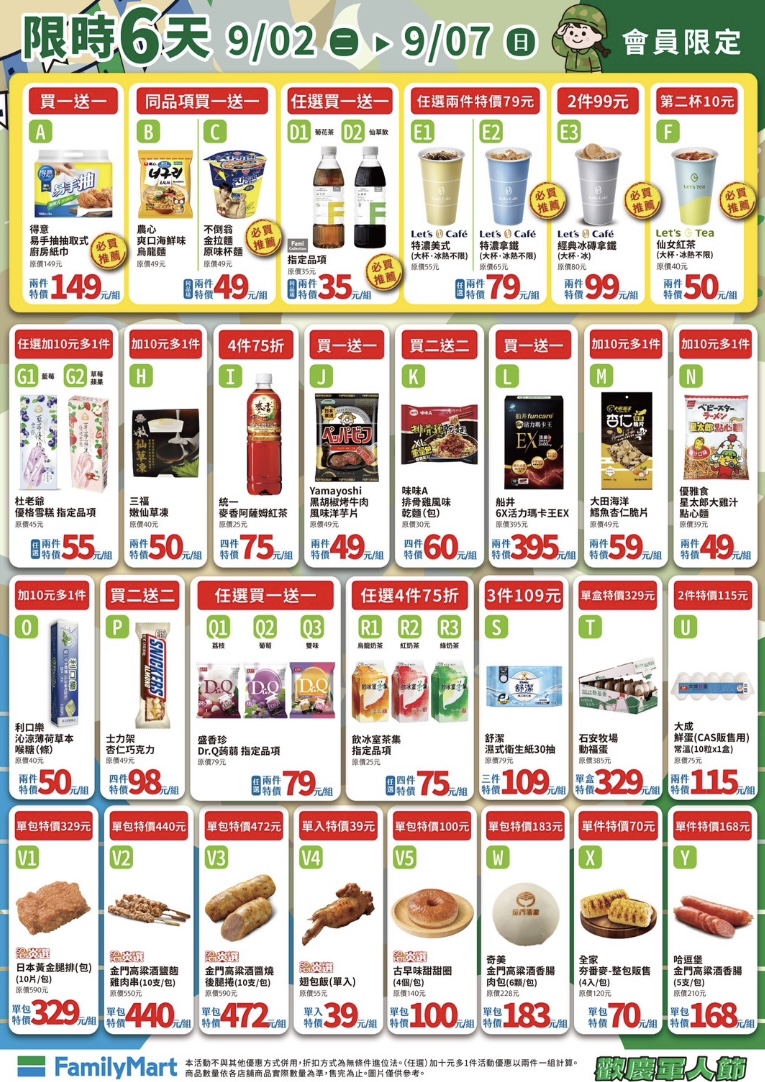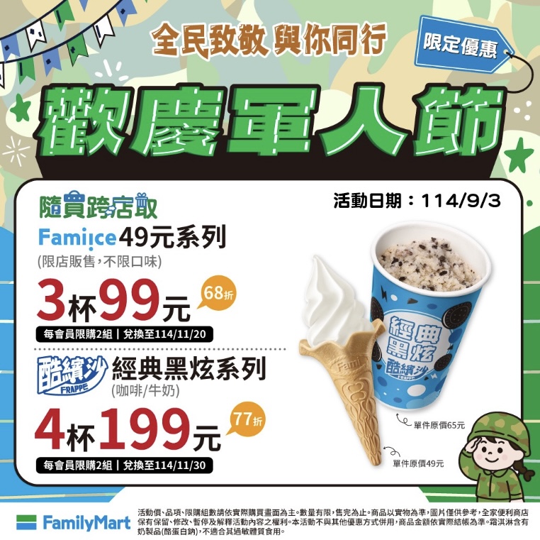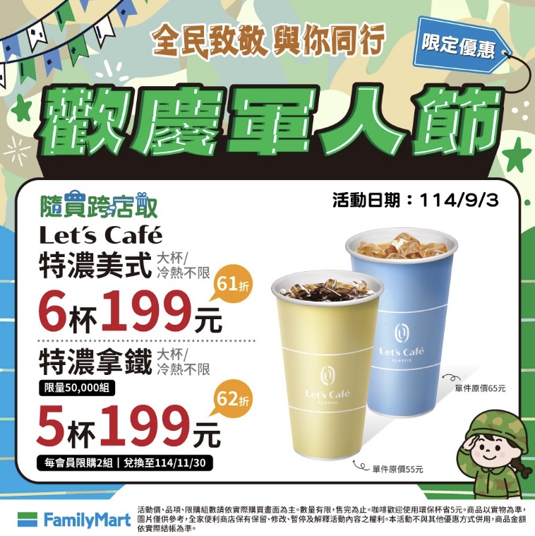 93軍人節優惠報到!全家便利商店員本週三開跑的會員優惠提早到週二登場,大杯特濃拿鐵兩杯79元逼近買一送一優惠,此外還有仙女紅茶第二杯10元(兩杯50元)、大杯經典冰磚拿鐵兩杯99元,韓國泡麵農心爽口海鮮烏龍麵、不倒翁金拉麵(原味)有買1送1優惠,軍人節限定一日優惠6杯大杯特濃拿鐵199元(均價一杯33元),可使用隨買跨店取購入、寄杯,優惠記得使用囉!
