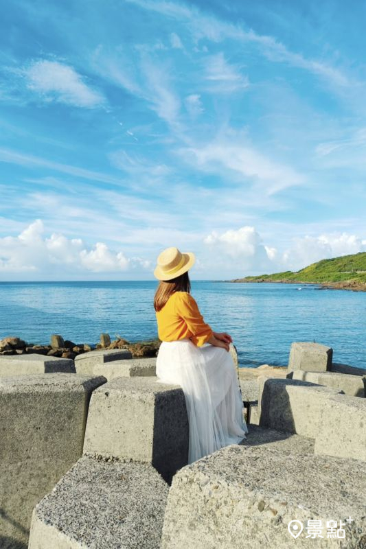 取景時除了必拍海景第一排美景,還能將藍色小船、夢之船小屋、彩繪階梯、彩繪牆、卯澳地標、貓咪造景及石頭屋等打卡亮點一同入鏡,周邊也能搭配涼亭及消波塊,捕捉絕美海岸風光。