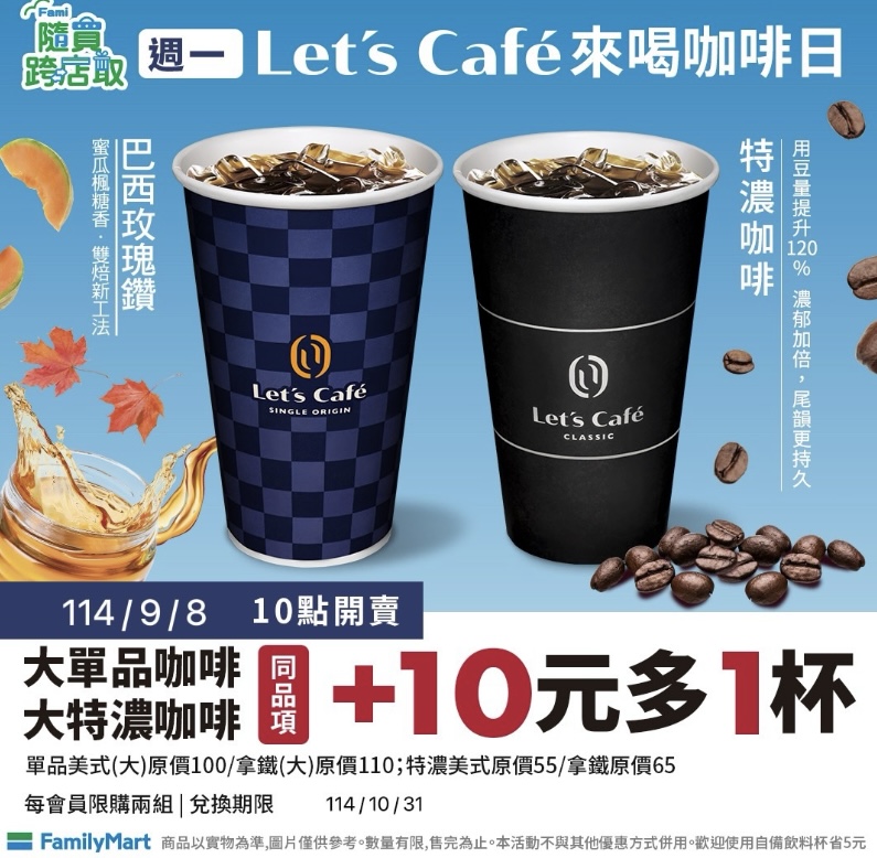 週一咖啡日超商推出的咖啡優惠把握起來,整個禮拜的咖啡錢更划算,全家便利商店推出的大杯特濃咖啡、大杯單品咖啡加10元多一杯,拿鐵品項也同樣有這樣的優惠,而且可以線上寄杯,每個品項每位會員可買兩組,兌換期限至9月30日,優惠折扣程度直逼買一送一,統一超商也有多組咖啡、茶飲組合價優惠,更有週一咖啡日、吉好運拜中元平安發發等活動,9月9日台灣狗狗日也有寵物糧食優惠,更有認購愛心小卡捐寵物糧食的活動。