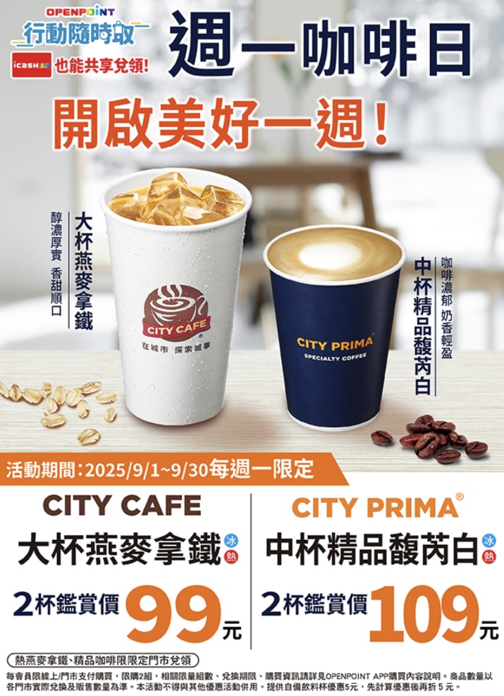 OPENPOINT行動隨時取9/9周二icash Pay支付限定-質感咖啡日