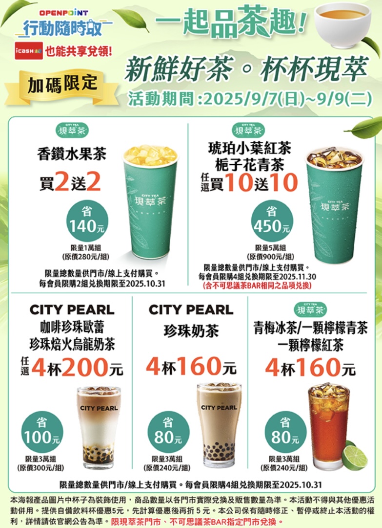 OPENPOINT行動隨時取於9/7~9/9推出每月7號一起品茶趣