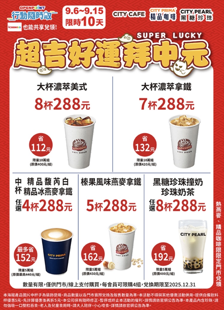 2.【吉好運拜中元平安發發】CITY CAFE大杯濃萃拿鐵7杯288元(限量10萬組)