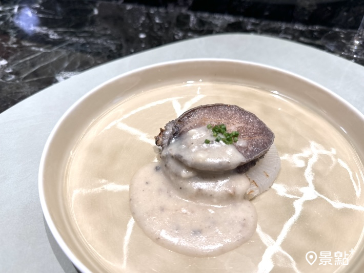來自日本播磨的生蠔,搭配昆布荷蘭醬並點上山椒油,厚實的海味被辛香提亮,尾韻清爽。南非活鮑鐵板煎香,搭配蘑菇奶油白醬,濃潤之中透著草本的清新。
