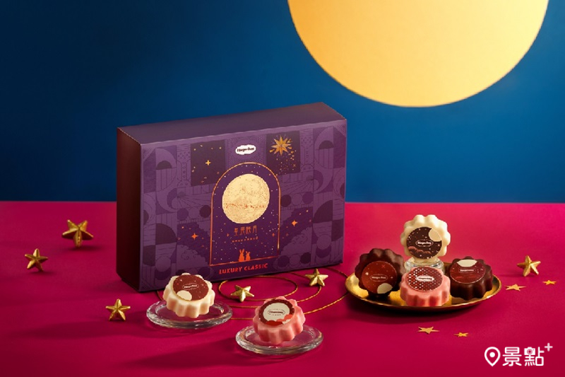 哈根達斯「星辰映月冰淇淋月餅禮盒」,以圓窗月相設計象徵美好心願的圓滿,繁星點綴的盒面猶如思念閃爍於夜空。6 款冰淇淋口味包含焦糖奶油脆餅、草莓、香草、芒果、比利時巧克力及咖啡等人氣口味,月餅上飾有造型各異的巧克力牌,6種圖紋獨具巧思,從閃爍星辰、月夜雲彩到月隱星現的樣貌,每一顆都宛如明月般的祝福!