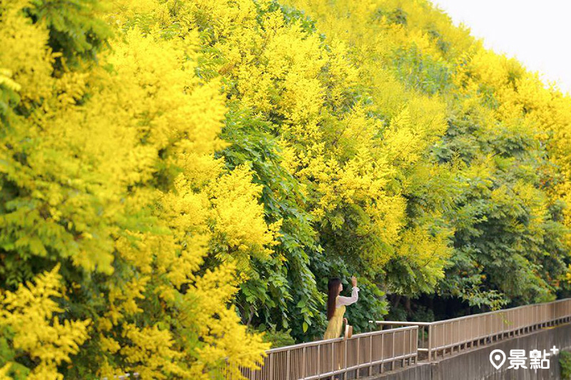 「米粉寮大排步道」可賞綿延2公里的欒樹美景,現場還能將水岸橋影一同入鏡,是一處號稱「全台最美排水溝」的經典欒樹景點。
