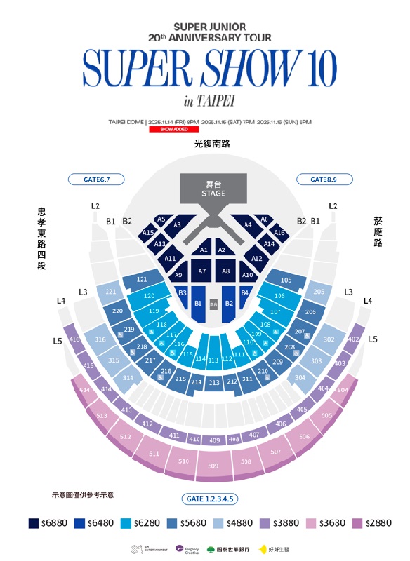 韓流人氣團體SUPER JUNIOR正式宣布臺北大巨蛋再加場!他們8月起從首爾開跑舉辦巡演「SUPER SHOW 10」,主辦單位遠雄創藝日前宣布2場臺北大巨蛋已完售,9月15日再宣布加場,「SUPER JUNIOR 20th Anniversary TOUR in TAIPEI」確定於11月14日加場,門票採兩階段販賣,於9月21日上午11點起全面開賣。