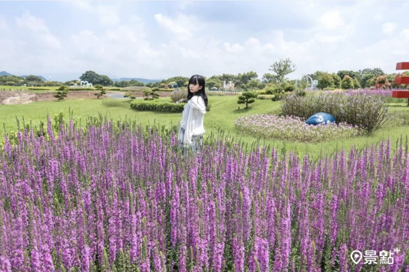 同期還能賞繽紛的小百日草、紫花蘆莉草、千屈菜、天使花以及台灣欒樹美景,推薦花海迷善用前後景,拍出不同層次與顏色的花海同框美照。