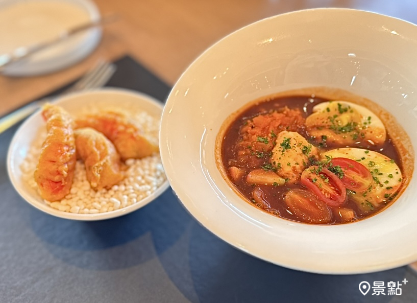 喜愛海鮮的饕客則不可錯過「天婦羅炸蝦番茄手工細麵」,製程採法式龍蝦湯概念,將烤過的原隻白蝦以奶油快速爆炒提煉香氣,再加入香料、蕃茄、蔬菜、白蘭地慢燉四小時,呈現海味馥郁的濃湯;佐料蝦醬採用新鮮飽滿的蝦肉,經乾蔥、蒜頭、奶油、茴香酒調味。主食方面除了手工揉製Q彈有勁的蝦丸以外,天婦羅炸蝦的金黃色麵衣更蘊含巧思,融合烏魚子奶油與蒔蘿,更顯海潮鮮味;後以軟糯溏心蛋與解膩的醃漬蕃茄點綴色彩,每一口皆為味蕾的全新探索。