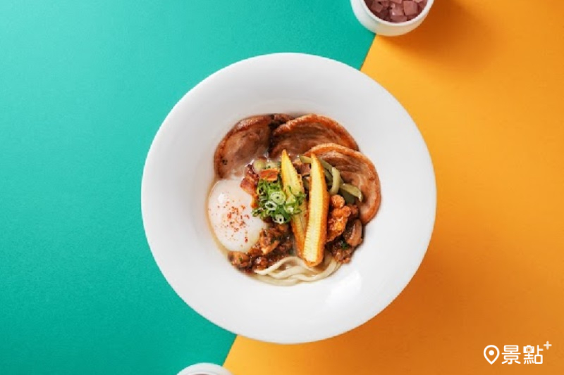 「焦香叉燒湯麵」上桌即芳香撲鼻,豬大骨經大火滾煮後呈現奶白色湯頭,軟嫩叉燒以冰糖炒至焦化、保留其甜味,後放入添加了蘋果威士忌、八角、味噌、昆布、乾香菇及黑白胡椒等多重佐料的醬汁中燉煮四小時。西式風味醬食材包含培根、洋蔥、蘑菇與滷汁,創造中西合璧的絕妙滋味;配料炸玉米筍的麵衣中以印度香料瑪薩拉提味、另備清爽酸黃瓜,亦推薦於湯中拌開63°C溫泉蛋,層次更為鮮明。