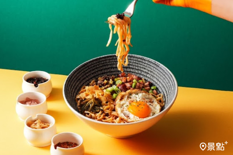 除了湯麵以外,主廚特別為乾拌麵派的擁護者打造「辣味台灣豬肉醬起司香腸手工乾麵」,靈魂醬品選用本地豬肉、肝腸、乾蔥與香料烹煮,再疊加西式雪梨醋、特調辣醬、辣粉與叉燒滷汁,更符合市場偏好。主角則為切做丁狀的起司香腸,經披薩爐窯烤後帶出深層燻香,伴隨清脆的剝皮辣椒與四季豆增添口感,並點綴以牛奶煮過後去辛留甜的油炸蒜片,必嚐老饕吃法為將香酥煎蛋的半熟蛋黃與乾麵拌勻一併享用!