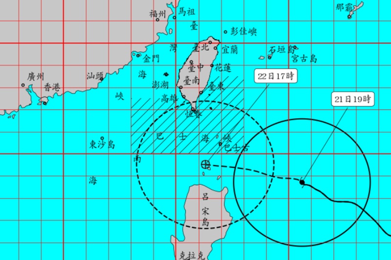 颱風及其外圍環流影響,21日晚至22日蘭嶼、綠島、屏東縣局部地區有平均風9級以上或陣風11級以上發生的機率(橙色燈號),新北市、桃園市、新竹市、新竹縣、苗栗縣、臺中市、南投縣、彰化縣、雲林縣、嘉義縣、高雄市、宜蘭縣、花蓮縣、臺東縣、澎湖縣、金門縣、連江縣局部地區有平均風6級以上或陣風8級以上發生的機率(黃色燈號),請注意防範。