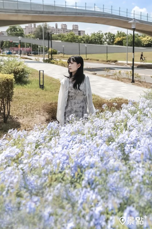 「1895乙未保台紀念公園」藍雪花海綻放,吸引人前往取景。(圖/aday0530)