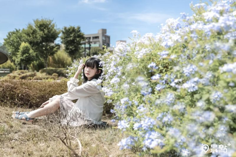 「藍雪花」別名藍茉莉、藍花丹,非常適合台灣氣候,花期為春季、夏季及秋季,株高約1到2公尺,淺藍色小花組合成花團,外觀宛如藍色雪花般,充滿浪漫又清新的氛圍。取景時可以將花海作為前景,將環形橋身一同入鏡。