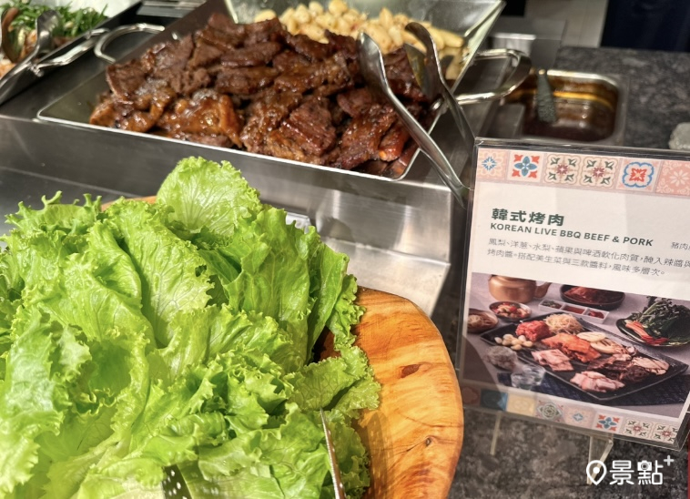 說到韓料不可缺的就是「韓式烤肉」,在十二廚的餐檯上一次吃到3種韓式烤肉,主廚分享以鳳梨、洋蔥、水梨、蘋果與啤酒醃製肉質,可以軟化纖維並帶出果香,再拌入辣醬與水果烤肉醬,風味清爽不油膩。鐵板區提供三款招牌肉品:「韓式川辣豬五花、韓式碳烤豬肉、韓式碳烤板腱牛」,搭配美生菜與三款特製醬料,重現正宗韓國烤肉魅力。假日午晚餐限定更升級為「現煎帶骨牛小排」。