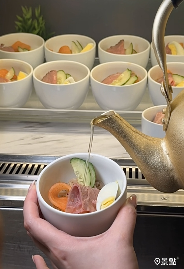 「韓式牛肉水冷麵」以蕎麥粉與麵粉3:7比例製成,麵條更具Q彈口感,搭配牛肉與蔬菜熬煮後冰鎮成冰沙湯頭,入口沁涼爽口,重現平壤經典風味。
