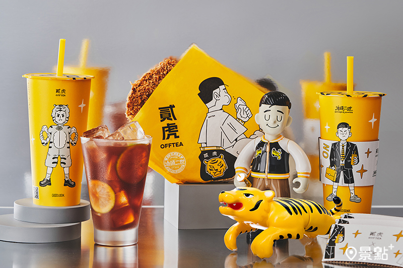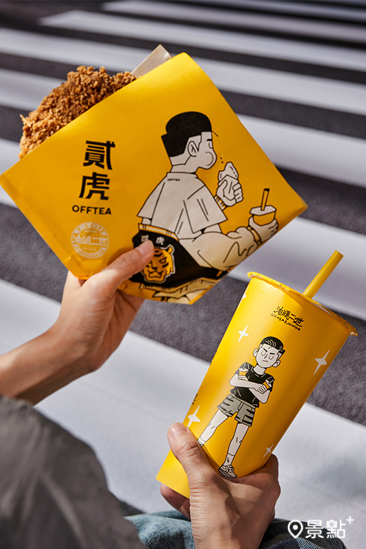 此外,貳虎 OFFTEA 攜手潮流藝術家「油頭二世」,推出限定杯身、旋轉換裝杯套與炸物袋,讓手搖飲搖身一變成為潮流單品。