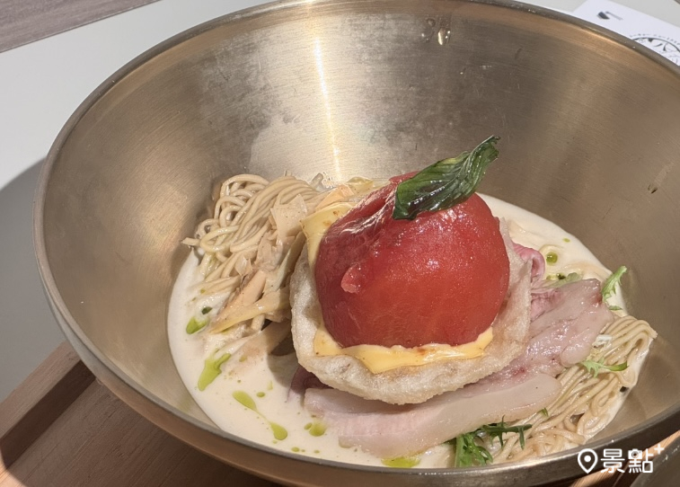 「醃漬番茄瑪格麗特風拉麵」(9/26-9/27限定) 以豚骨高湯為基底,結合五花肉、洋蔥與香蒜的甘香,再佐新鮮羅勒、菠菜與奶香乳酪,加上整顆醃漬番茄的酸甜,將義式料理手法呈現在日式拉麵。新感覺的豚骨拉麵,呈現酸甜濃郁、層次豐富,這是獨屬於居山主廚的創新系拉麵。