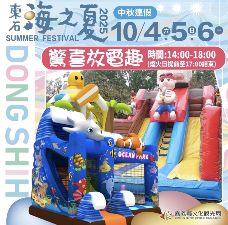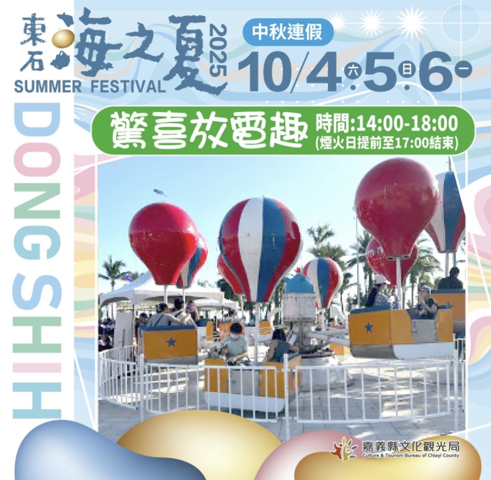 原於7月19、20、26、27日4天,在東石漁人碼頭舉辦指標性夏季活動「2025海之夏」,因受丹娜絲颱風強風影響,延期至10月4-6號,正好是中秋連假,尤其10月6日中秋夜的海上煙火秀備受矚目,還有演唱會、市集等活動相當精彩!