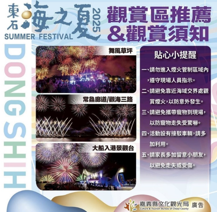 文觀局表示,交通方面除無障礙服務-復康巴士及計程車外,10月4日與5日設有嘉義高鐵站、東石國中及東石先天宮三處免費接駁站點。
