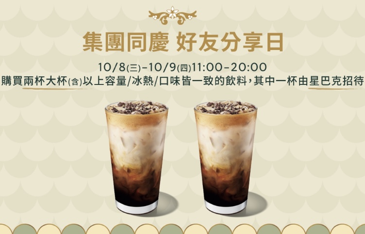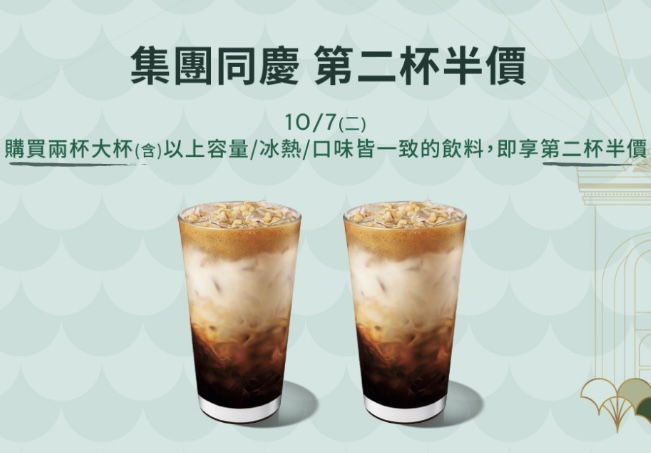 星巴克買一送一!第二杯半價集團同慶連3天雙十連假滿額送點