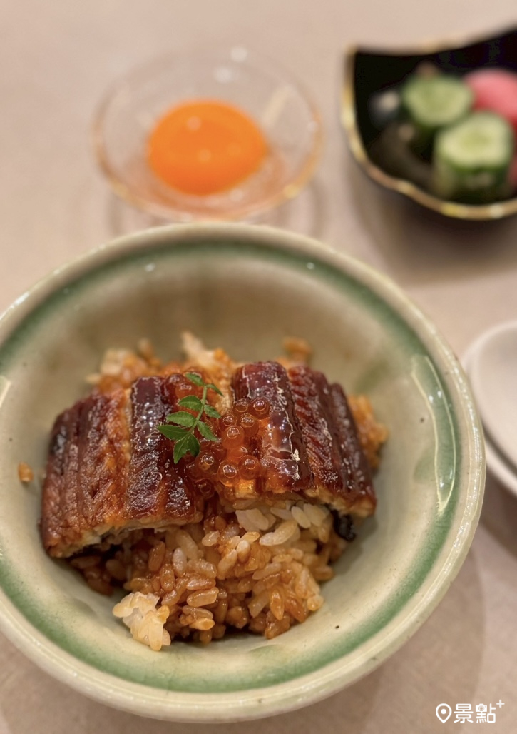 主食「鰻魚月見小丼」先將鰻魚蒸熟再以炭火炙烤,刷上特製醬汁後香氣四溢,鋪於晶瑩飽滿的月光米上,再覆上半熟蛋液,醬香、米香與蛋香交織,層次豐富滿足。