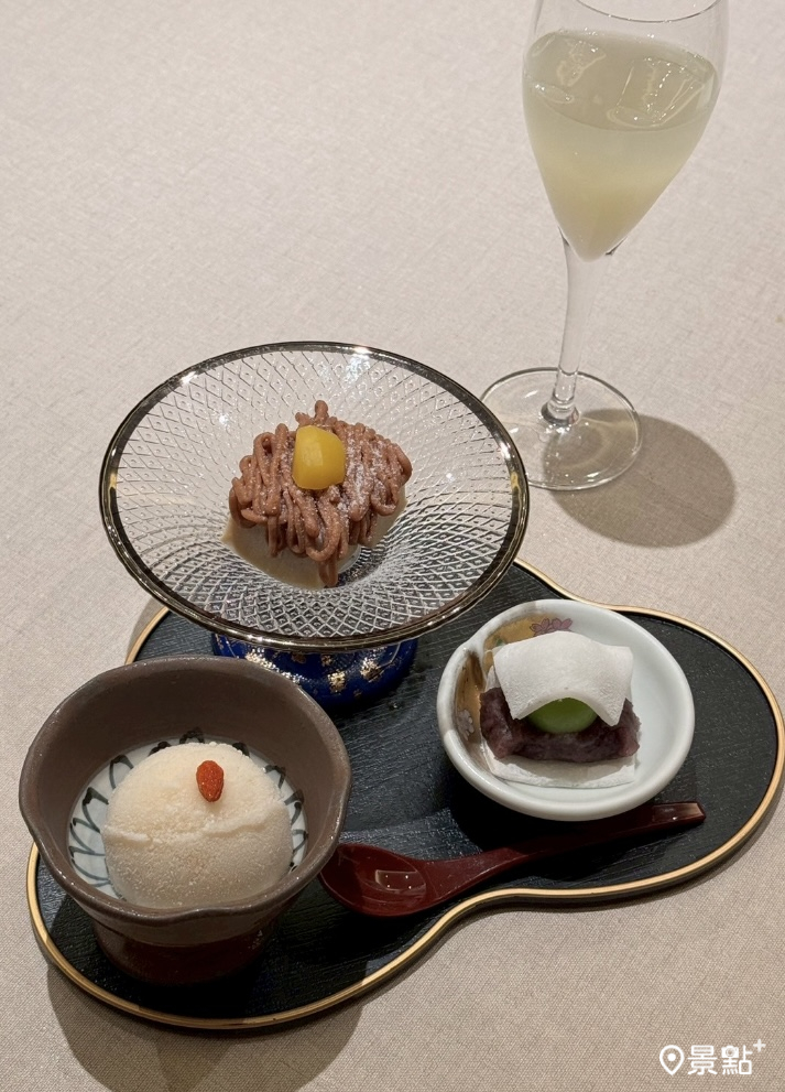 甜品部分,「岡山晴王麝香葡萄大福」以Q彈軟糯的外皮包裹清甜多汁的麝香葡萄,再層疊一抹細緻紅豆餡,口感豐富而清香。「白桃雪酪」沁涼爽口,濃郁白桃香氣在口中綻放,留下清新餘韻。「黃豆粉豆腐栗子蒙布朗」則以綿密的栗子餡結合香氣濃郁的黃豆粉與細緻豆腐慕斯,香醇厚實卻不顯甜膩。三款甜點相映成趣,為整場秋季會席劃下華麗卻不失清雅的完美句點,「秋之旬味」會席套餐每套4,980元+10%。