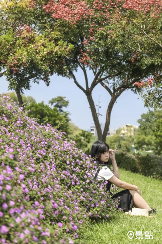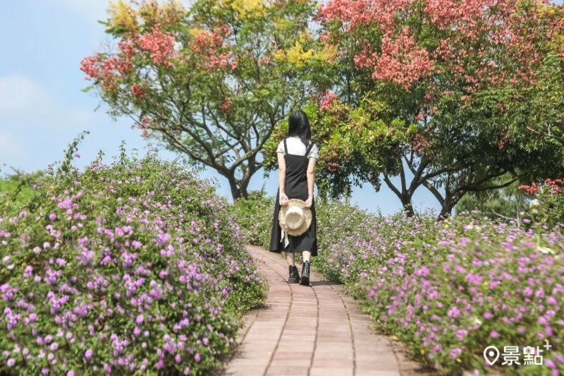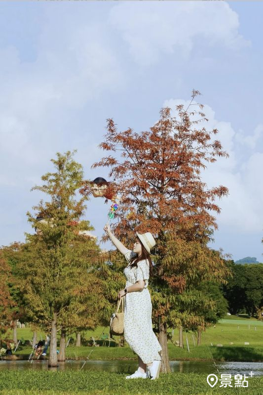 2025年9月中旬園內湖畔落羽松提早轉紅,現場能搭配水景及藍天,捕捉充滿秋意氛圍的美照。花海周邊設有「LOVE」地標、雙心造型裝置、南瓜馬車、彩繪石頭等多種打卡亮點,還可將遠方的藍色煙囪一同入鏡。