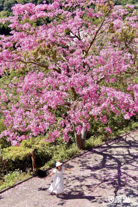 「基礎忠恕道院」地點位於桃園市龜山區大棟山路,在院區停車場下方種有3棵美人樹,其中有一棵正盛開,搭配旁邊的九重葛花海牆,形成一處充滿粉紅氛圍的美拍景點。