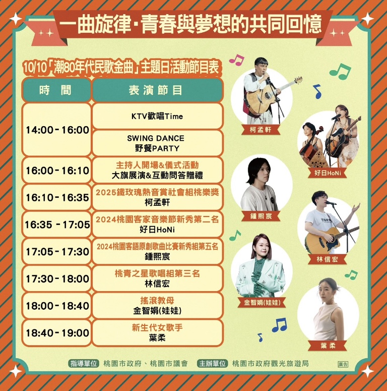 「潮80年代民歌金曲」10/10晚間16:00至19:00將於慈湖水岸舞台登場。開場結合大旗展演與雙十限定有獎問答,為音樂盛會揭開活動序幕。