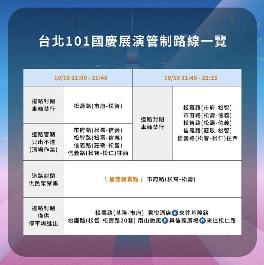 國慶煙火施放前將實施交通管制,如欲前往信義區相關道路、搭乘公車者要特別注意管制、改道的狀況。