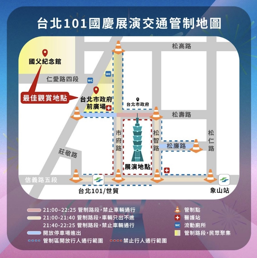 交通管制資訊:10/10 17:00 起台北101、南山A21基地及臺北市政府周邊地區將逐步實施交通與人潮管制