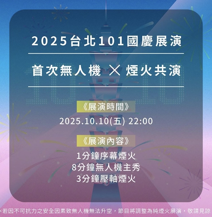 為因應2025國慶展演活動,台北101購物中心及觀景台預計於2025/10/10(五)調整營業時間如下: