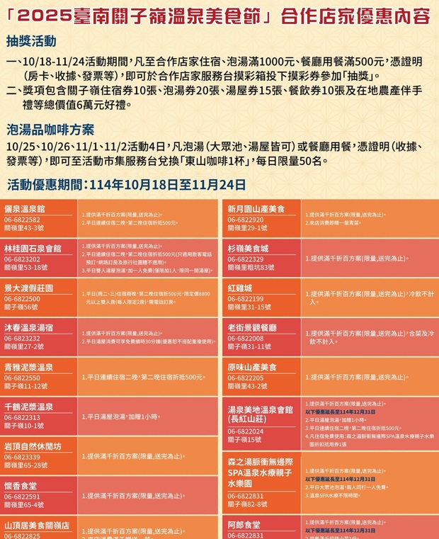 此外,在10月18日至11月24日活動期間,民眾只要於19家合作店家住宿、泡湯滿1,000元或用餐滿500元,即可於店家服務台投入摸彩券參加抽獎。獎項包含關子嶺住宿券、雙人湯屋泡湯券、大眾池泡湯券及關子嶺農特產伴手禮等總價值6萬元的多項好禮。