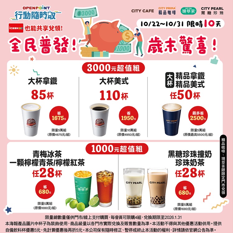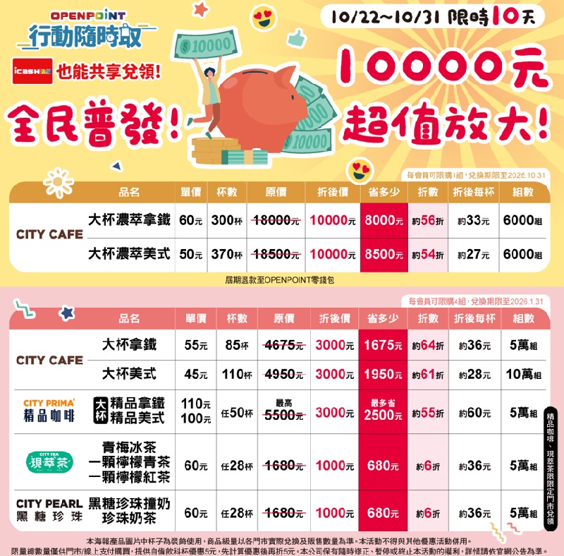 7-ELEVEN響應政府普發萬元政策,推出「政府萬元發放超值放大活動」,消費者可於OPENPOINT行動隨時取自10月22日至10月31日購買,限時祭出CITY系列飲品組合優惠,其中推薦必買「萬元超值組」CITY CAFE大杯濃萃美式370杯(一杯相當27元左右)、「萬元超值組」大杯濃萃拿鐵300杯,最低優惠54折起(一杯相當於33元左右),精省逾8千多元,歲末歡樂補給就趁這波買起來!