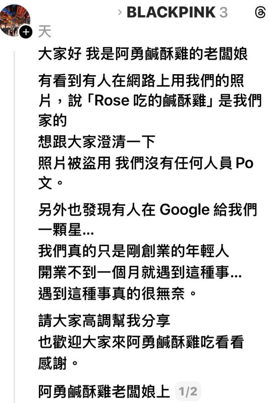 高雄演唱會的第二天 Rosé 品嘗了鹹酥雞,網路上傳出的同款店家為不實資訊,老闆娘在 Threads 上發文表示遭假冒、照片盜用,並已報警處理,因此目前只能確認 Rosé 品嘗的鹹酥雞是有加洋蔥的版本,被網友稱讚「超懂吃」。