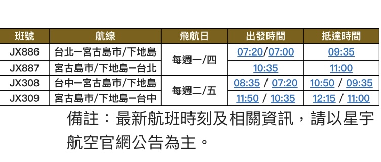 星宇航空表示:「宮古島限定航線自今夏以來,深受旅客喜愛,顯示市場對沖繩外島旅遊的高度潛力,因此自明年起將轉為定期營運。未來不僅讓台北旅客能持續輕鬆前往這座海島秘境,也希望藉由新增『台中-宮古島』航線,讓更多旅客能從中部直飛日本,享受高品質的飛行體驗與度假時光。」