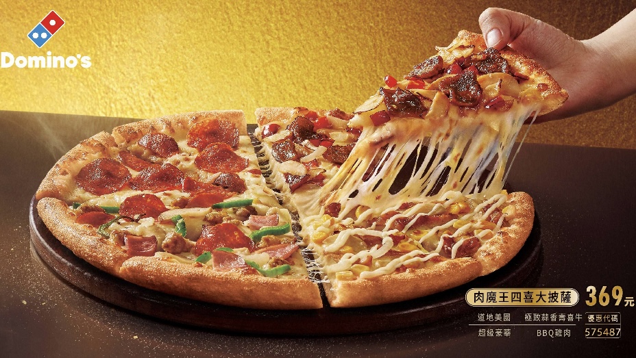 專為肉食愛好者打造的「肉魔王四喜大披薩」,匯聚四款精選人氣口味,「極致蒜香壽喜牛」、「超級豪華」、「BBQ雞肉」、「道地美國」一次滿足,新上市外帶優惠價每個只要 369元。