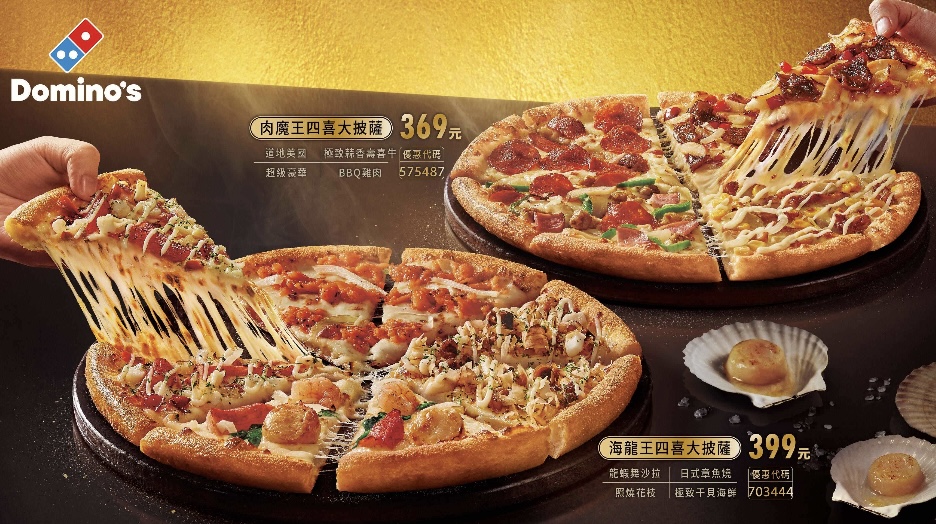 「海龍王四喜大披薩」嚴選四款人氣海鮮口味,鮮美層次分明,專為海鮮控打造;「肉魔王四喜大披薩」則融合四種醇厚肉香,口感濃郁飽滿,滿足肉食族群的豪邁渴望。兩款新作不僅展現達美樂對食材與風味的極致追求,更貼近消費者真實需求,一顆披薩四種口味,讓聚餐不再為口味糾結,輕鬆滿足多重美味。