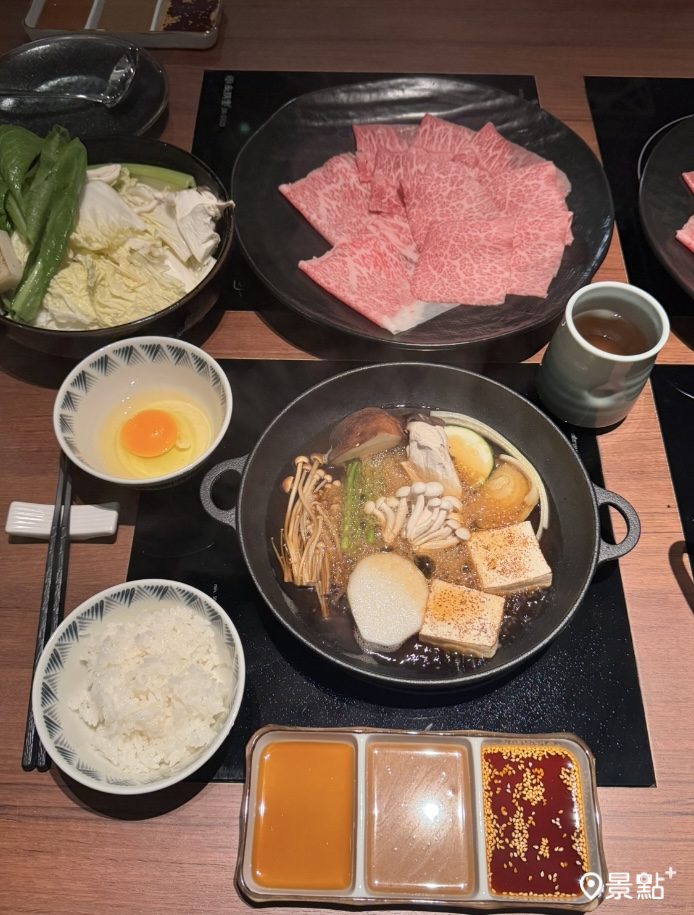 店內壽喜燒則採關東式煮法,將醬油、味琳、清酒、上白糖、蘋果熬煮而成的「割下」醬汁倒入鐵鍋中煮開,加入肉片、板豆腐、厚香菇、山藥、黑蠔菇、日本大蔥等配料,煮好後以蛋液沾食。這與以羅臼昆布,鰹節高湯涮煮的淡雅涮涮鍋,形成一濃郁、一清新的迷人對比,讓饕客依喜好選擇,滿足每個人對味道的不同追求。