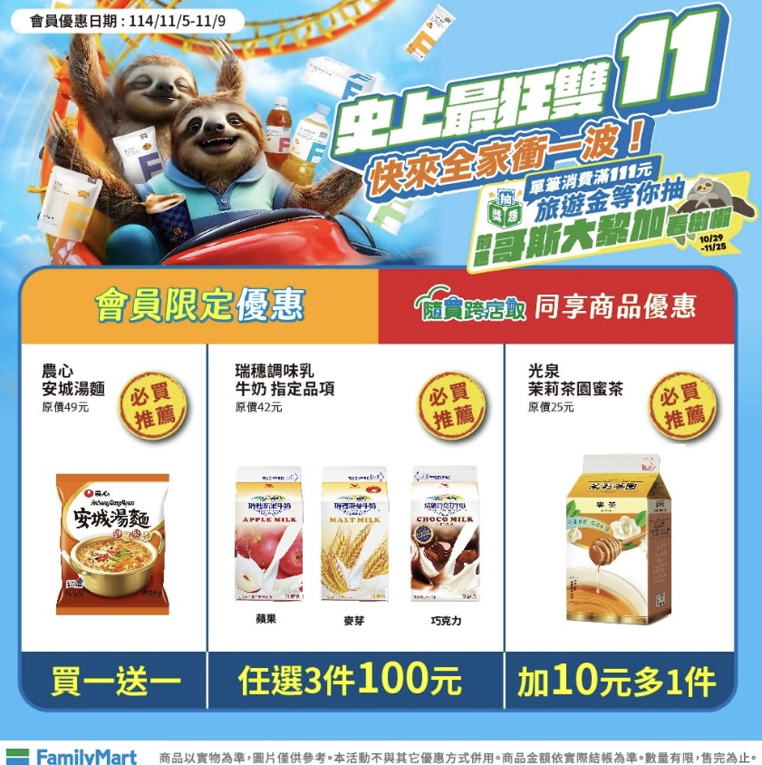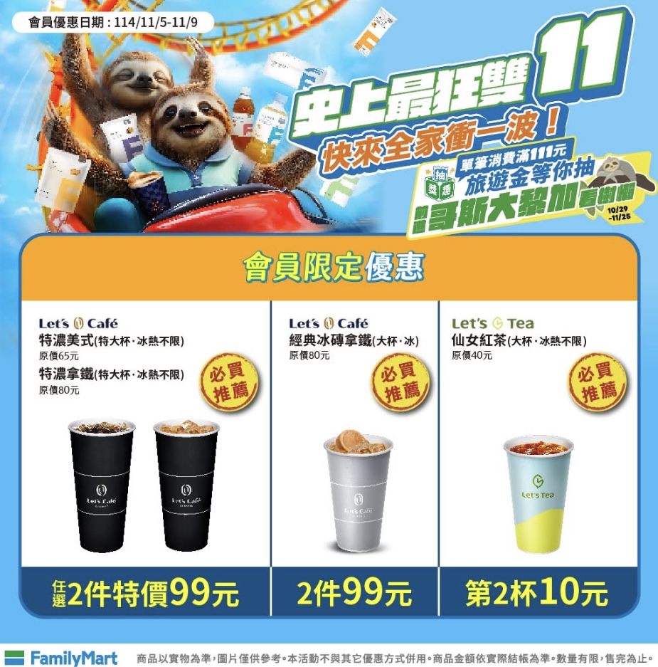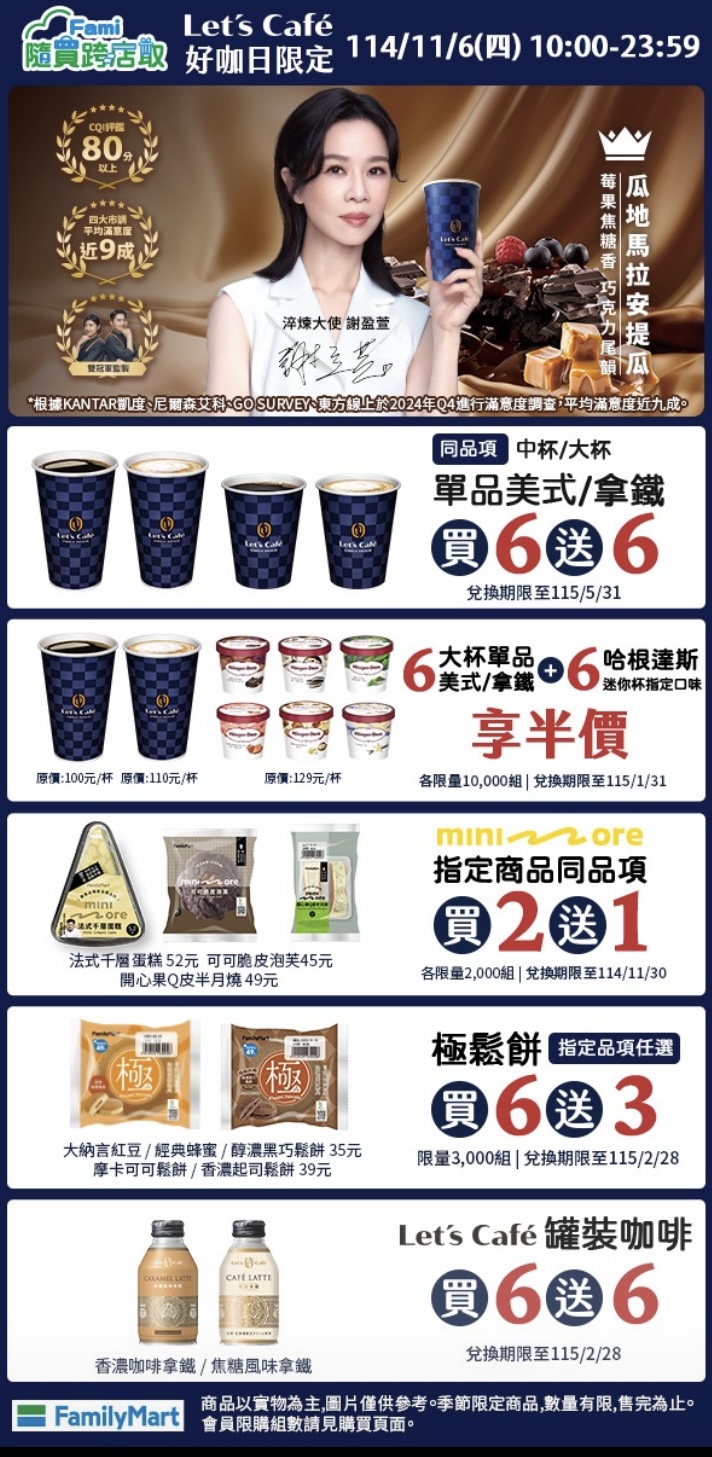 本週迎來每個月6日的全佳好咖日,從單品咖啡買一送一放大(買6送6)、Let's Cafe罐裝咖啡買6送6,到哈根達斯冰淇淋組合享半價,以及極鬆餅買6送3,minimore甜點買2送1,都是11月6日好咖日限定,使用全家便利商店隨買跨店取就可以寄杯囤貨,並且享有優惠!此外,針對雙11檔期推出的飲料、零食、泡麵等優惠11月5日到9日展開,優惠要把握!
