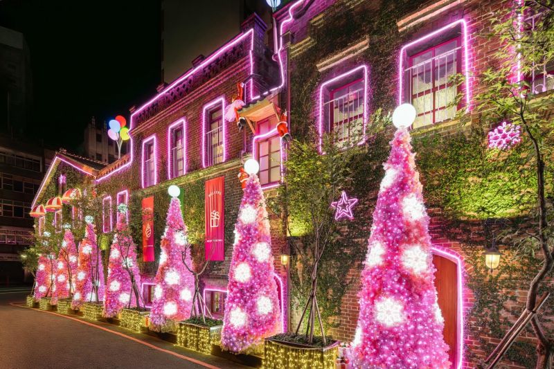 2025年聖誕造景以「粉紅派對」為主題,不僅點亮夢幻粉紅燈海,也於建築右側及門前打造9棵粉色系聖誕樹,建築上方的彩色氣球,則為整體造景增添了不少趣味氛圍,亮燈時間為晚間17:30。