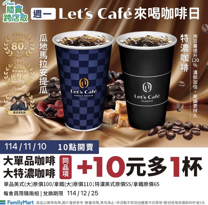 週一咖啡優惠追起來,加上響應雙11購物節超商推出相關優惠,全家便利商店週一咖啡日大杯單品咖啡與大杯特濃咖啡加10元多1杯,上午10點開始開賣,拿鐵品項也有同樣的優惠,兌換期限到12月25日;7-11則有週一指定咖啡品項2杯99元的優惠,其次還有行動隨時取、7-11購物DAY的優惠即將結束,近日想要省荷包喝咖啡飲料的消費者可以多加把握,挑選適合自己的優惠品項追起來!