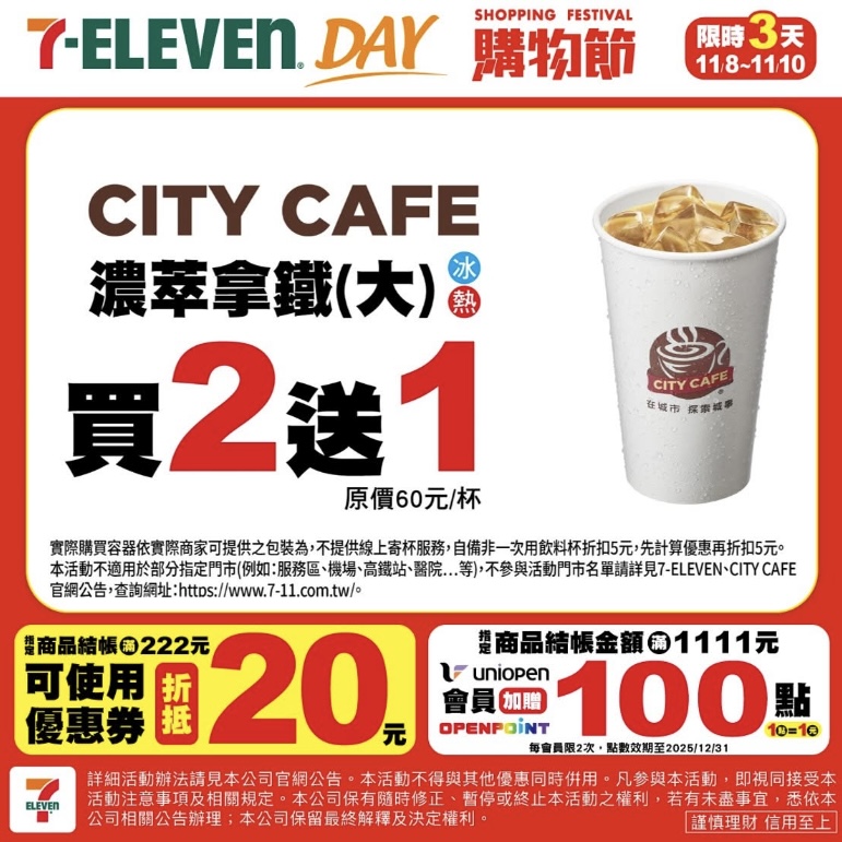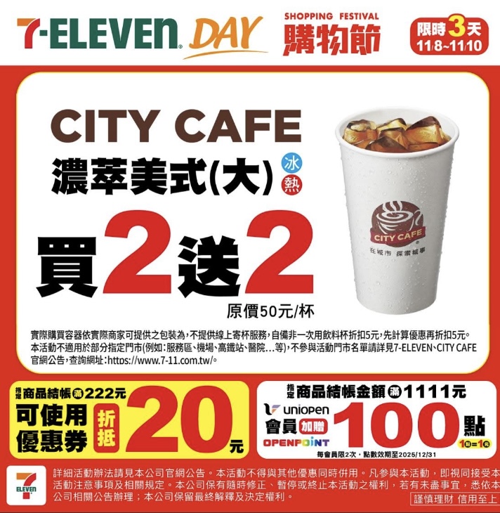1.CITY CAFE特大美式買11送11優惠價660元 (每日限量1.5萬組)