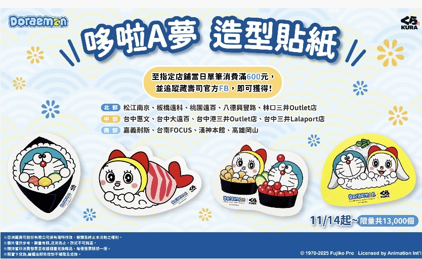 最後驚喜再加碼!哆啦 A 夢限店滿額贈也同步開跑,只要至全台 13 間指定店舖消費滿 600 元註 2,追蹤藏壽司官方 Facebook,即可獲得哆啦 A 夢「造型貼紙」乙張!4款共限量 13,000 個,快揪朋友一起進入哆啦A夢的歡樂時光吧!