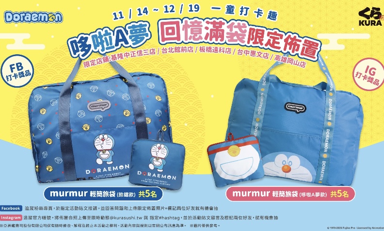 自 11 月 14 日起,只要在這些店鋪找到哆啦 A 夢佈置並拍下合照並完成指定步驟,就有機會把超可愛的哆啦 A 夢「murmur 輕簡旅袋」帶回家。