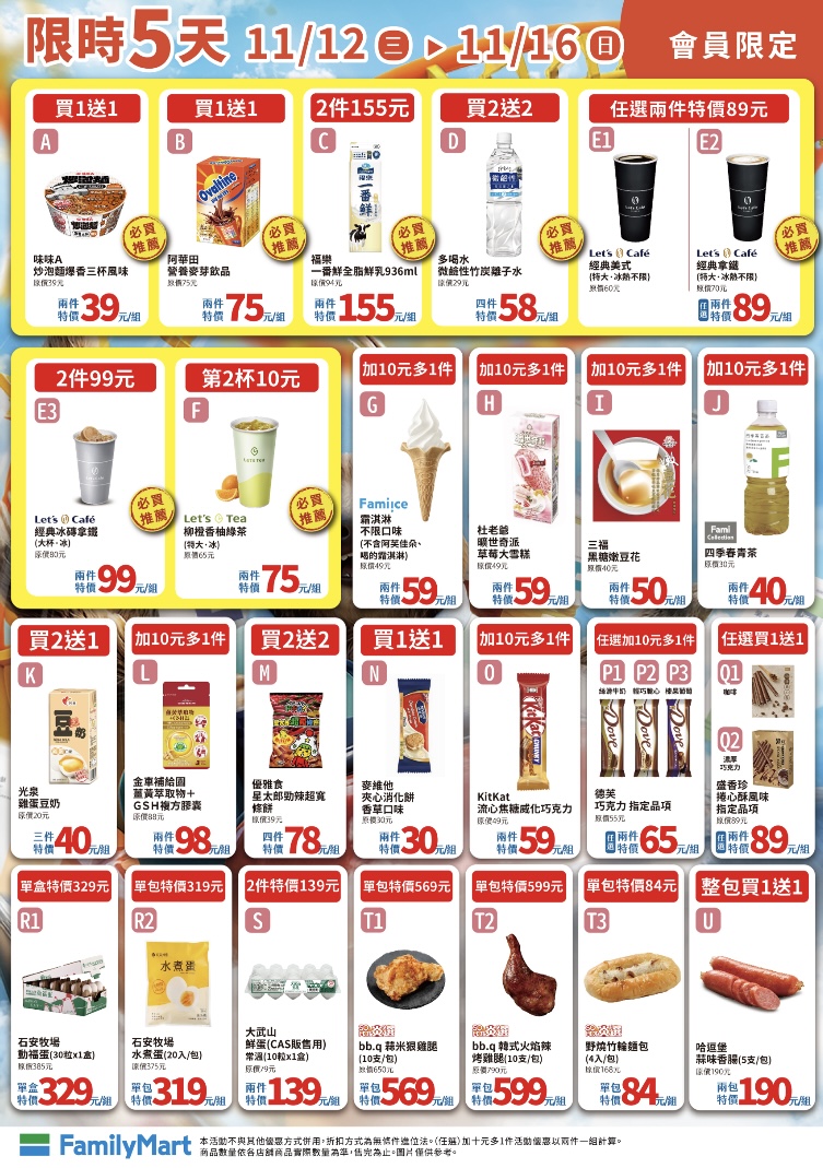週三起跑的全家便利商店會員優惠,本週有大杯經典美式、大杯經典拿鐵兩件89元的優惠(拿鐵品項相當於第二件10元,逼近買一送一優惠),另有農心辣白菜泡菜湯麵(袋裝)、味味A炒泡麵也有買1送1的優惠,這一週的Let's Cafe經典冰磚拿鐵兩杯特價99元(不限冰熱),柳橙香柚綠茶兩件特價75元(第二杯10元),優惠至11月16日週日,優惠把握起來!