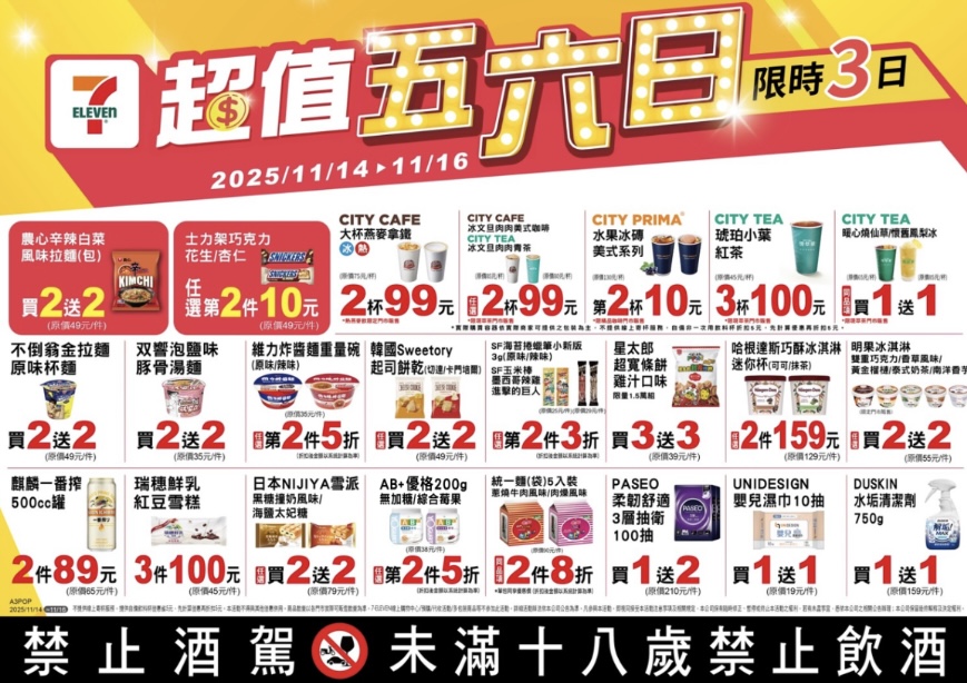 7-11週末超值五六日週末優惠開跑!咖啡茶飲買一送一、第二杯10元、兩杯99元等多元優惠,11月14日飯糰2個50元,另有咖啡分享季11杯咖啡優惠寄杯組合價,活動至11月21日止,連同本週週末優惠一起把握起來!