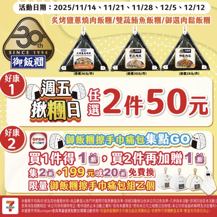 「週五揪糰日」指定飯糰任選2件50元,單筆交易每購買2件指定御飯糰可再加贈1點。