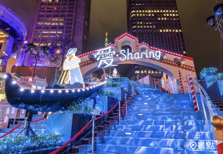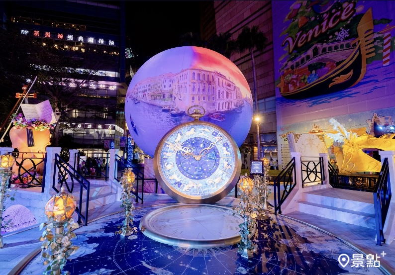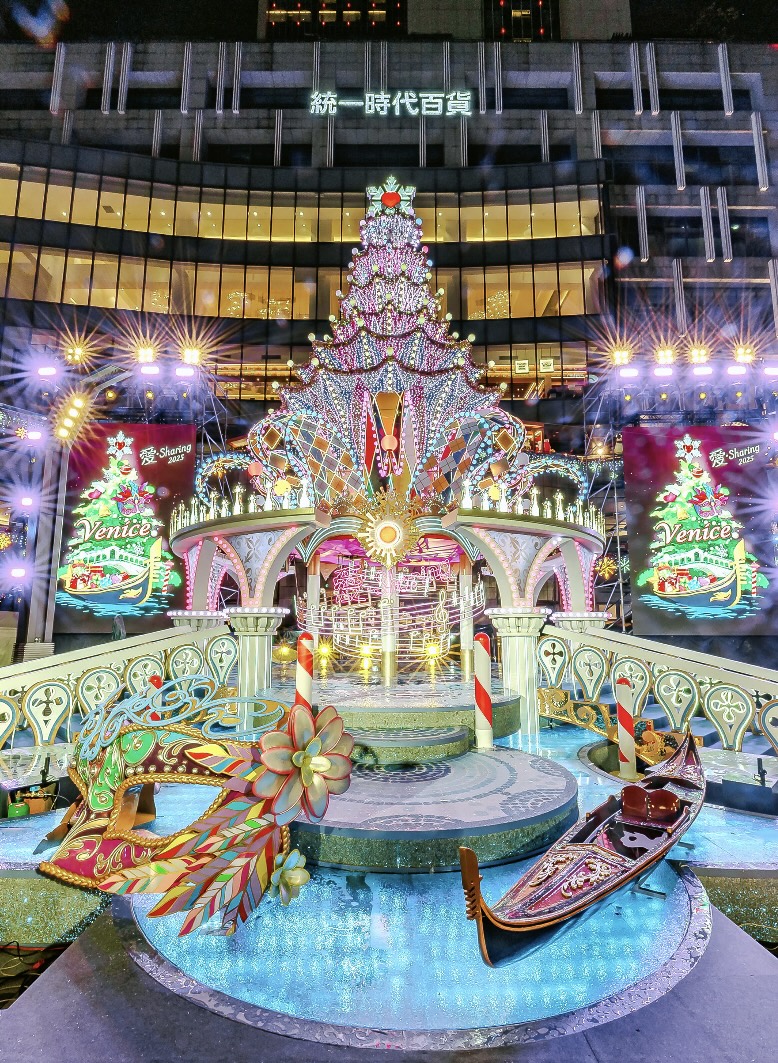 聖誕主樹外,也規劃了更多主題裝置,展現聖誕節與威尼斯獨有的特色。台北時代百貨夢廣場,從大步梯開始就充滿了粼粼波光,廣場上的威尼斯總督宮、香氛花園與日落時分乘坐貢多拉船享受唯美的情定威尼斯,每個場景彷彿置身水都。