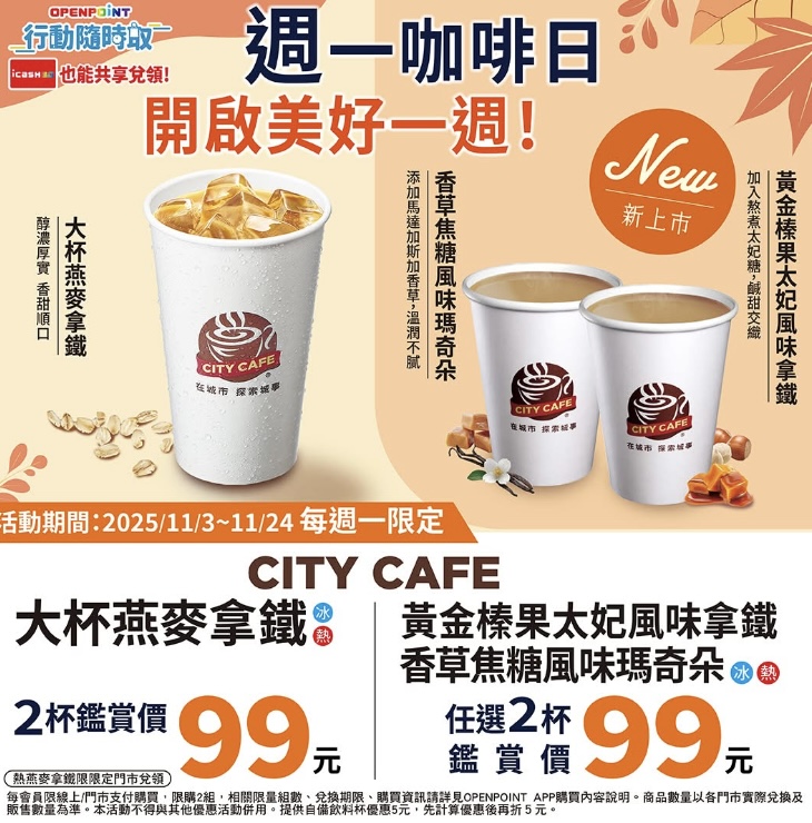 OPENPOINT行動隨時取11月每周二質感咖啡日,限定icash pay支付